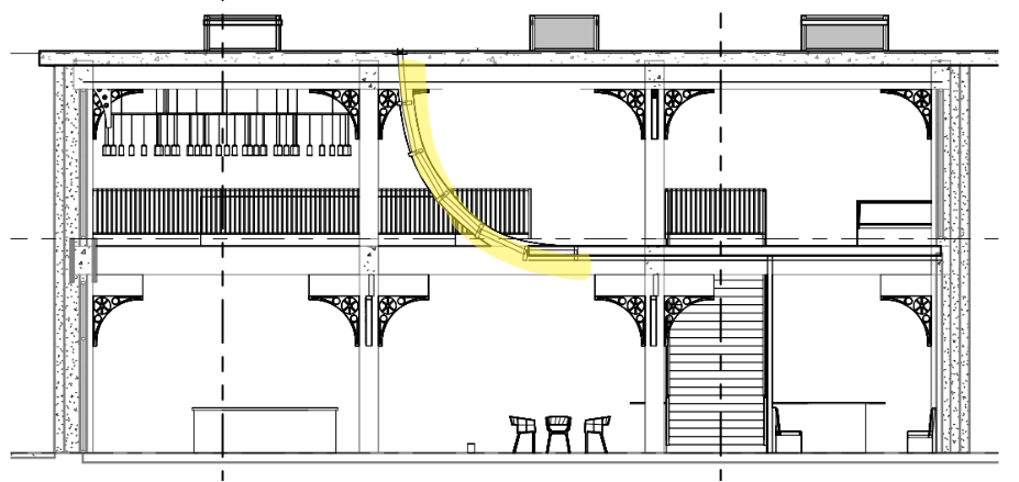 The main design element here is the highlighted wall in the section above which uses decorative panels to mimic the sides of a historical airship.