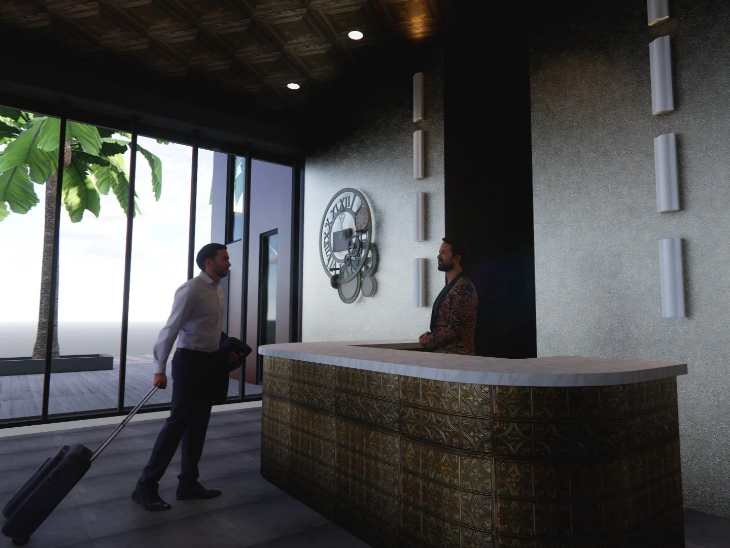 The lobby is inspired by an airship hangar. On the ground floor, guests can check-in and enjoy a cup of coffee and some conversation in the lobby café. From there, they "board the airship" by climbing the staircase to the Brews and Boards restaurant.