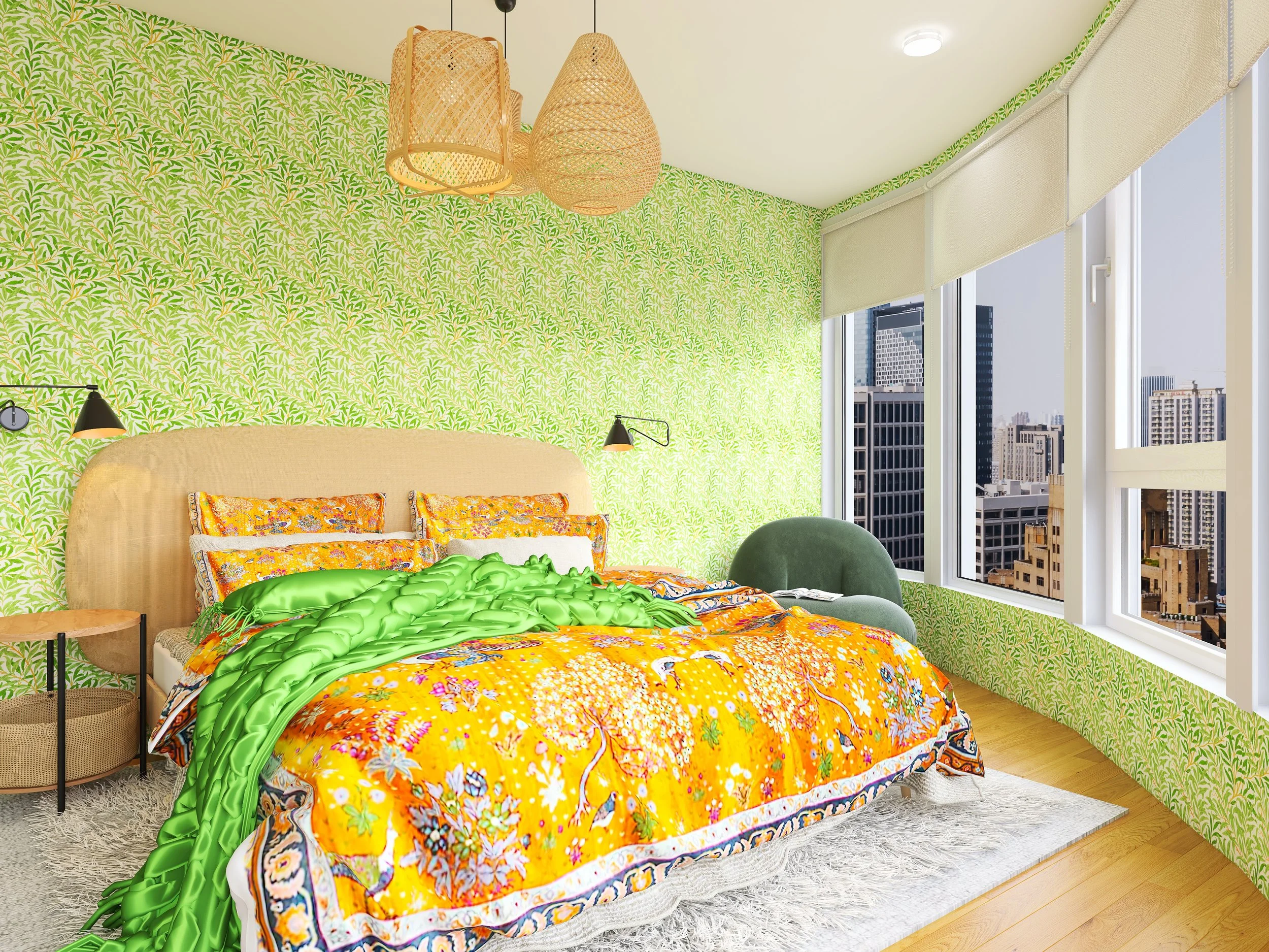 Patterns and textures layer up in the main bedroom to evoke that favorite childhood fort. The bathroom features 70s prints and tiles but with modern fixtures for easy cleaning.